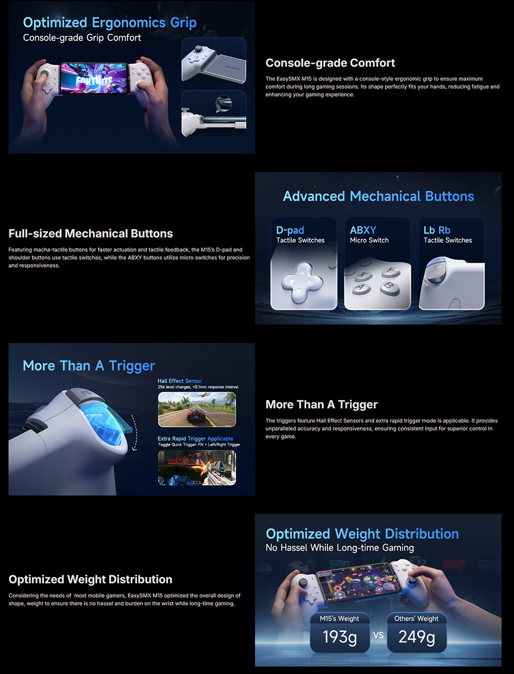- 進階機械按鍵:搭載機械觸感按鍵,提供更快速觸發與清脆回饋。方向鍵與肩鍵採用觸控開關,ABXY 按鍵使用微動開關,確保精準度與響應速度。