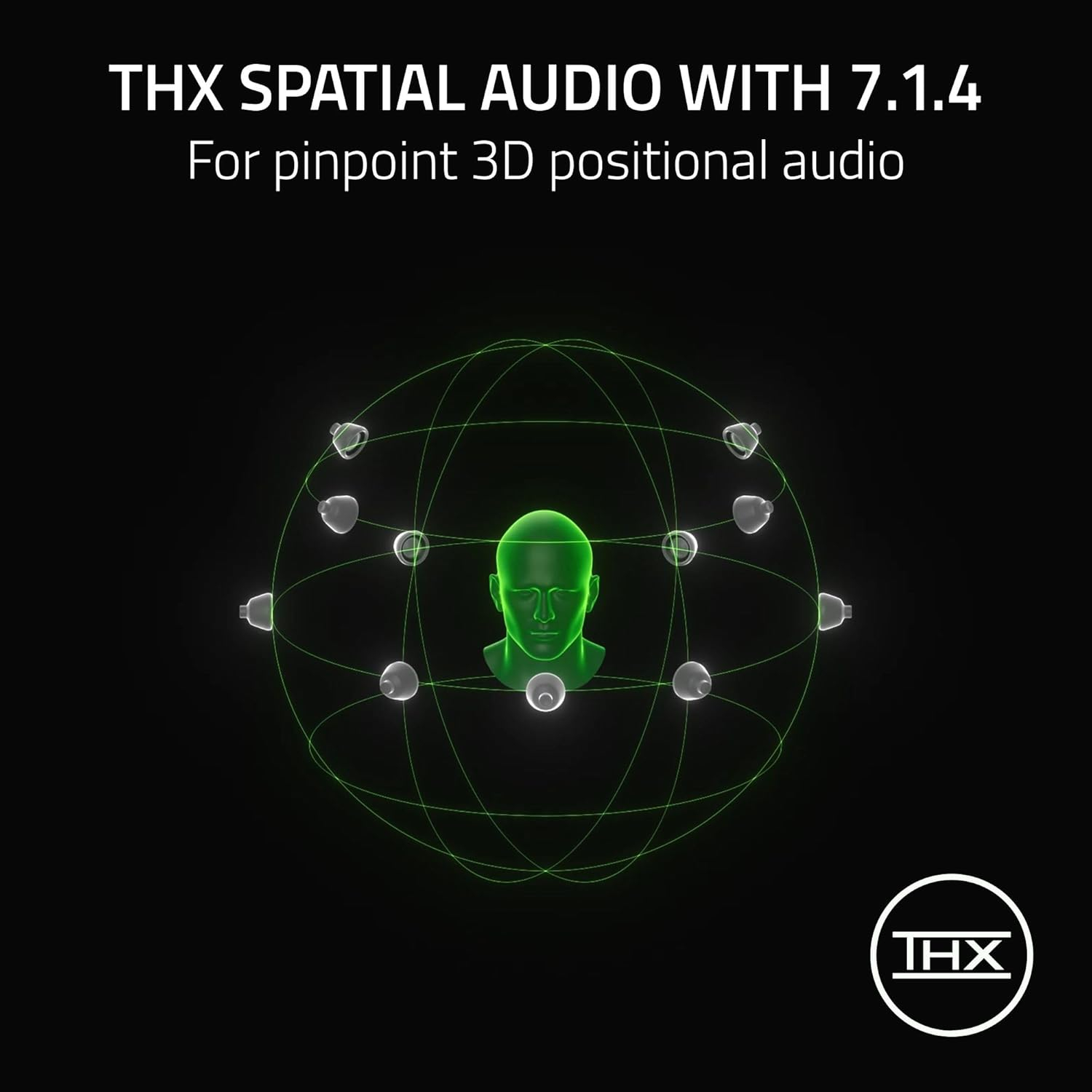 - THX Spatial Audio 7.1.4:整合於 Razer Synapse 軟體,提供身臨其境的 7.1.4 環繞音效(需在 Windows 11 版本 23H2 或更高版本上安裝 Razer Synapse)。