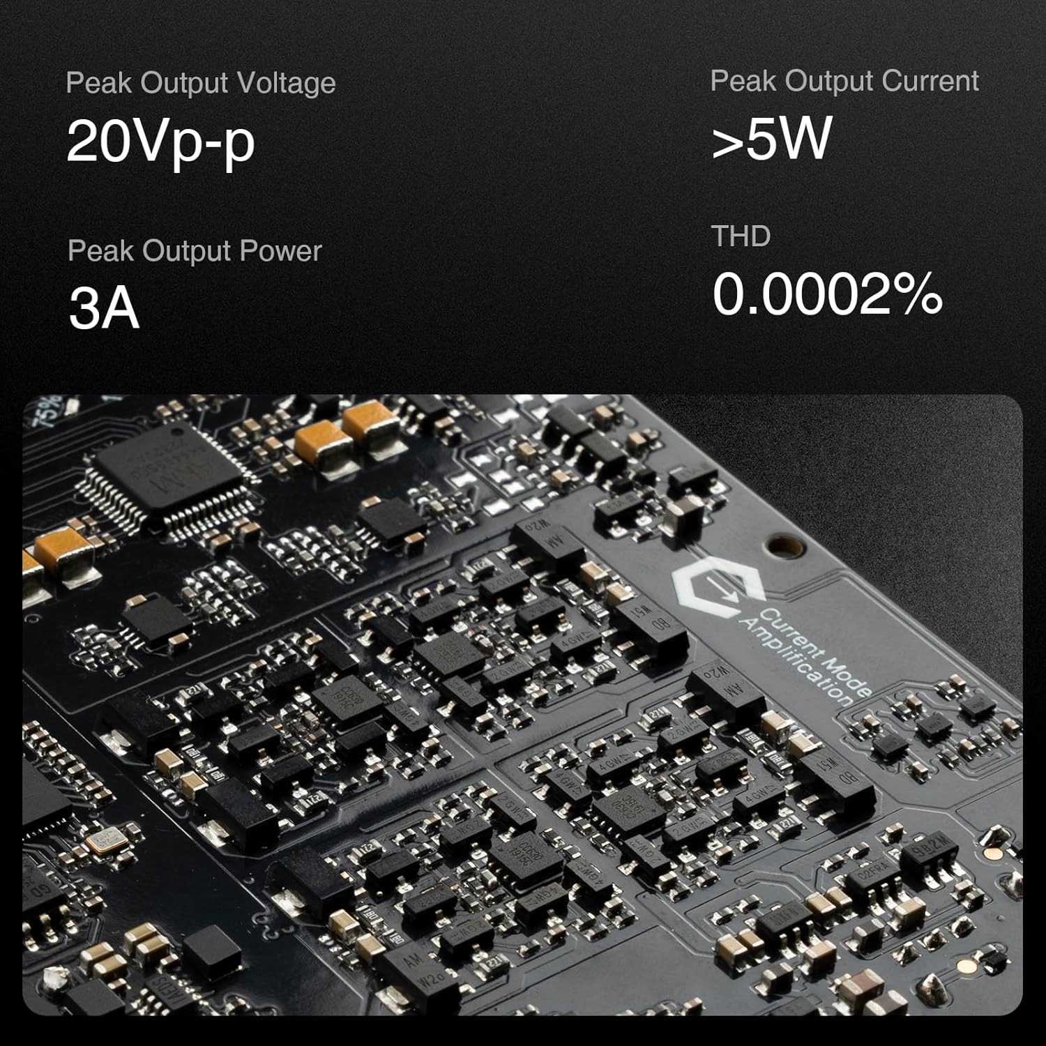 SIGMA 配備四組專利全離散、全平衡 CMA 耳機/輸出放大器。在便攜音訊設備中,如何平衡尺寸、功耗與音質是核心挑戰。Questyle 專利電流模式放大技術在小巧機身中同時實現強勁驅動力與細膩音色。全離散 CMA 峰值功率可達 >5W,峰值電流高達 3A,展現卓越的動態驅動能力。