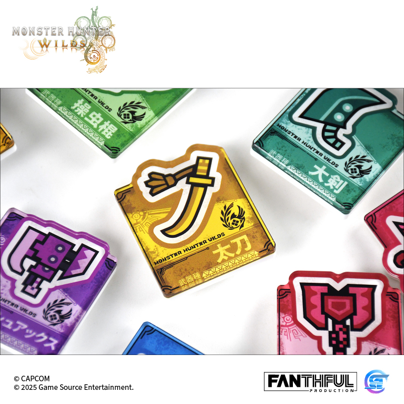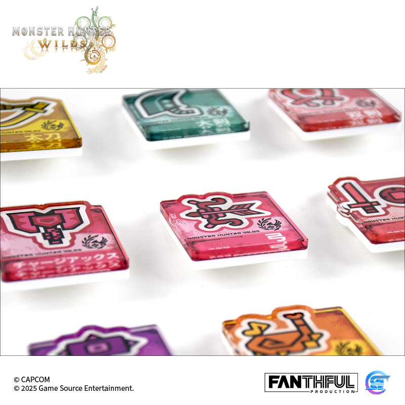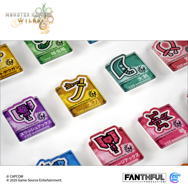 以遊戲中玩家們熟識的獵人武器圖標為主題設計的亞克力別針徽章。全14種風格各異的武器種類,悉數登場! 款式:大劍、太刀、單手劍、雙劍、大錘、狩獵笛、長槍、銃槍、斬擊斧、充能斧、操蟲棍、輕弩槍、重弩槍、弓,共14款盲盒包裝