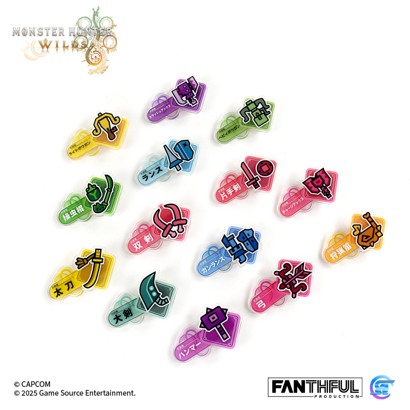 以遊戲中玩家們熟識的獵人武器圖標為主題設計的亞克力夾子。全14種風格各異的武器種類,悉數登場! 款式:大劍、太刀、單手劍、雙劍、大錘、狩獵笛、長槍、銃槍、斬擊斧、充能斧、操蟲棍、輕弩槍、重弩槍、弓,共14款盲盒包裝