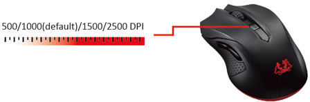 - 解析度:500 ~ 2500DPI;4 個等級(500/1000(預設)/1500/2500 DPI),配備 LED 指示燈