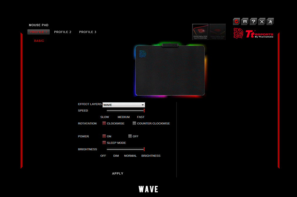 全新滑鼠墊軟體設計一如往常的簡單直覺,不需要繁複操作,只需輕鬆點擊即可創造出個人化特色的專屬電競武器,玩家可透過軟體自定義屬於自己的全彩背光效果,包括:燈光效果、顏色與速度,還可儲存三種設定隨遊戲類型自行切換,打造獨一無二的電競美學!