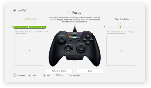 一邊移動拇指搖桿,一邊按下所指派的「焦點」/「敏捷」按鍵,即可降低/提高靈敏度,以方便精準瞄準或加快反應速度。使用 Xbox 專用 Synapse,還能進一步調整靈敏度。