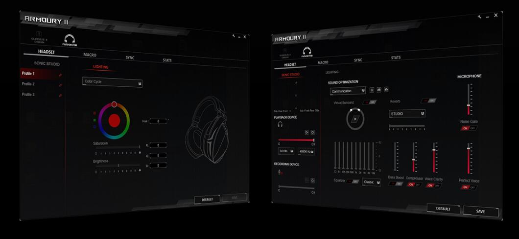 ROG Armoury II是一款提供直覺性介面以及全方位控制的軟體,您可以輕鬆調整ROG Strix Fusion 700,以您的專屬設定進行遊戲。從均衡(EQ)到7.1揚聲器級別平衡都可以全面調校,甚至可以為不同的遊戲類型和場景(如第一人稱射擊遊戲和賽車)創建以及使用不同的設定檔。