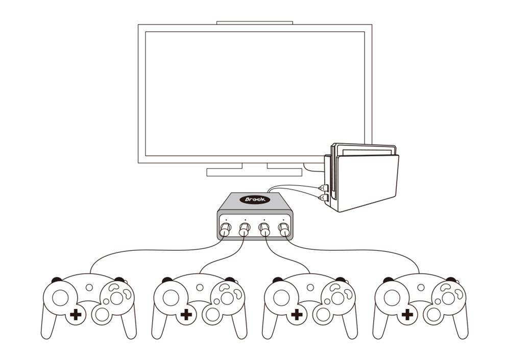 經由本產品可以連結GameCube 控制手把,Switch可透過二個本產品同時接上八隻GC手把進行“超級轟炸人 R”。