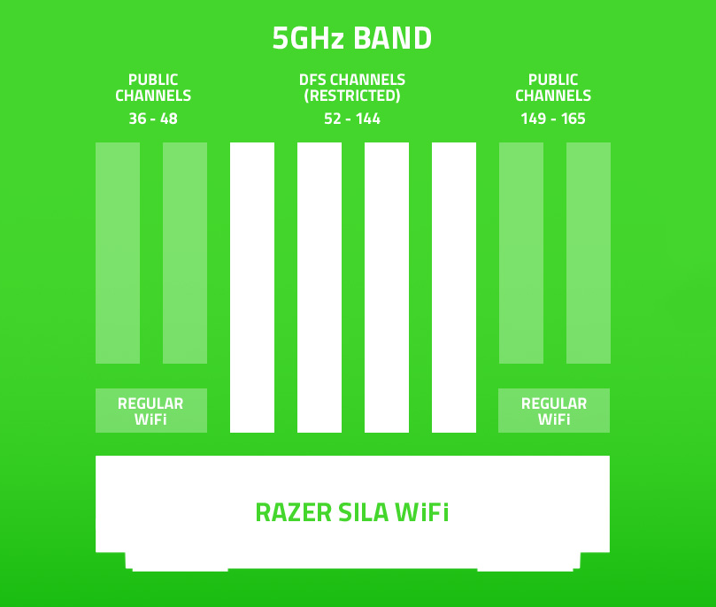 Razer Sila 採用多通道 ZeroWait ZWDFS技術,會掃描並為你自動切換至最佳通道,讓你總是能夠避開流量壅塞的通道。這項技術使用雷達感應硬體,讓你獨享通常設有限制的頻寬頻率。這些特殊通道讓你即使在尖峰時段,也能擁有極為快速可靠的 WiFi 並脫穎而出。
